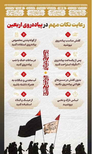 زائران اربعین حسینی(ع) طی ۳ روز، فاصله حدود ۸۰ کیلومتری نجف تا کربلا را پیادهروی میکنند، از اینرو رعایت یکسیری نکات ضروری است.