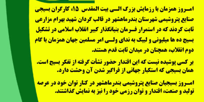 قدیر فرماندهی حوزه صنایع پتروشیمی شهرستان بندرماهشهر به مناسبت حضور مقتدرانه کارگران بسیجی در رزمایش اقتدار”