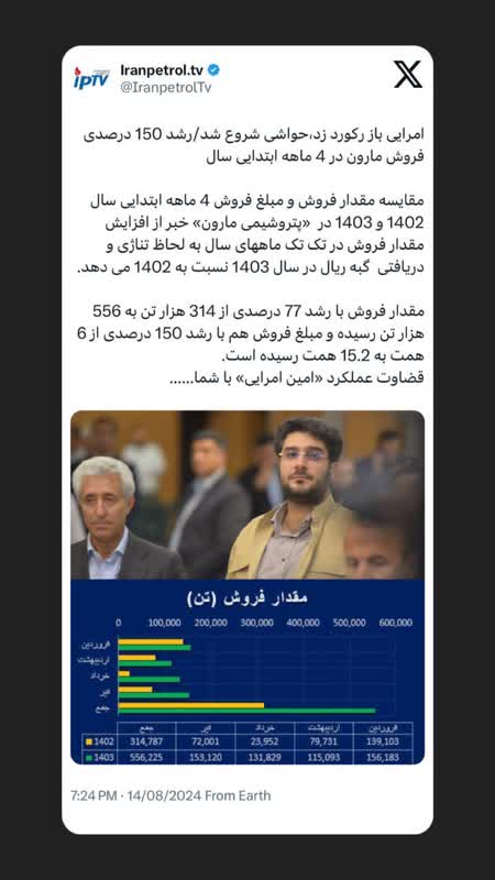 *امرایی باز رکورد زد،حواشی شروع شد/رشد ۱۵۰ درصدی فروش مارون در ۴ ماهه ابتدایی سال* به نقل از ایران پترول ، مقایسه مقدار فروش و مبلغ فروش ۴ ماهه ابتدایی سال ۱۴۰۲ و ۱۴۰۳ در «پتروشیمی مارون» خبر از افزایش…